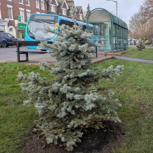 The third tree we have paid to have planted is a Picea pungens ‘Blue Diamond’ which, as its name suggests, has distinctive silvery-blue needles on a medium-sized, evergreen pyramidal tree. It is situated on Bowers Parade opposite the library. The Town Council plans to incorporate the tree into its Christmas displays.